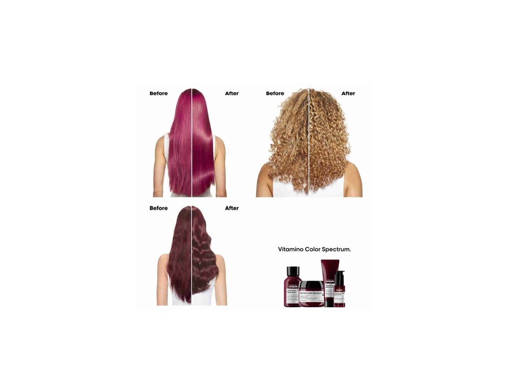 A L'Oréal Professionnel Serie Expert Vitamino Color Spectrum Glass Shine öblítésmentes szérum a festett hajnak azonnali és ultra magas fényt biztosít. A vízmentes formula az Alpha-silane hatóanyaggal bevonja a hajszálakat egy védőréteggel, amely a hő hatására aktiválódik. Ennek eredményeként védi a hajszínt az UV-sugarak ellen, szöszösödés ellen, nedvesség ellen (akár 80%-os páratartalomnál) ellen. A haj azonnal hidratáltabb, simább és puhább lesz, akár 10 hajmosásig.